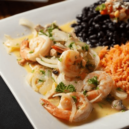 Butterflied shrimp sautéed with garlic, butter, mushrooms and onions. Served with tortillas. Served with rice and refried, pinto, or black beans. Add a side salad for an additional charge.