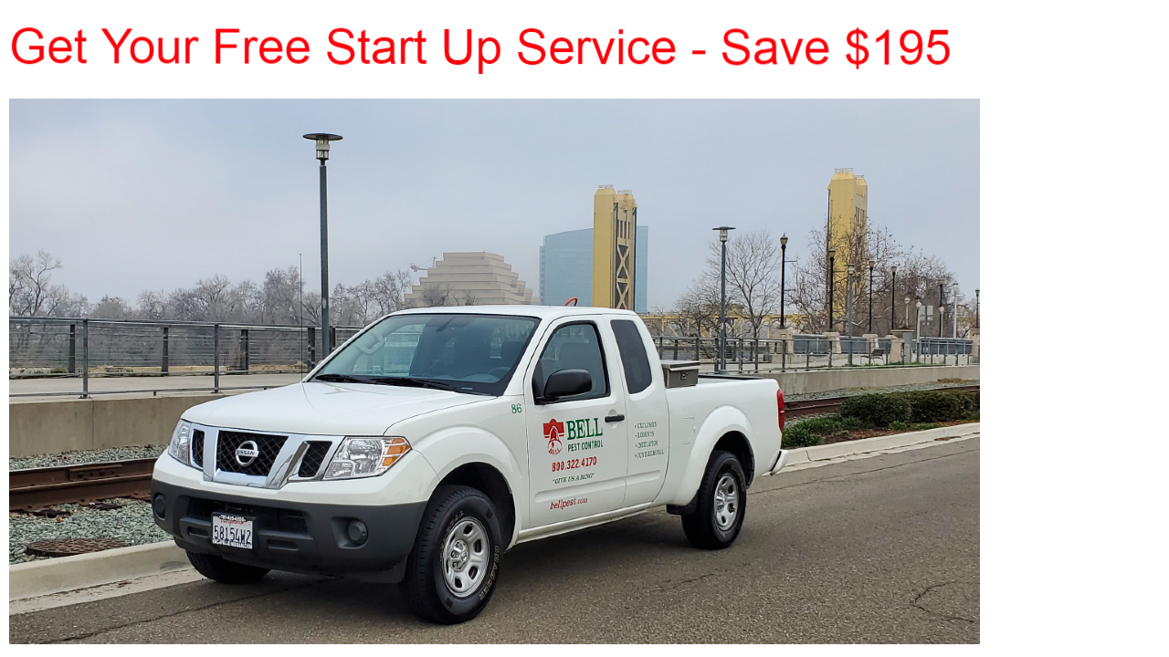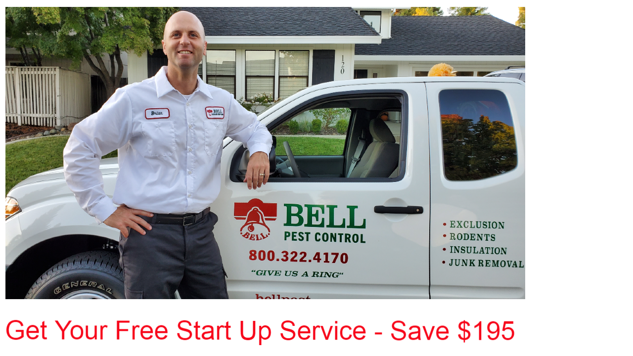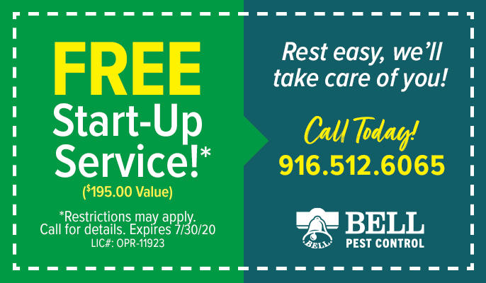 Free start up service with an agreement - You save at least $195. This special is good for Ants, Spiders, Silverfish, Earwigs, Fleas, Mice, Rats and Cockroaches*. Bell Pest Control has serviced the Greater Sacramento area since 1978. Your technician will be friendly, well trained and service oriented. (*some conditions may apply)